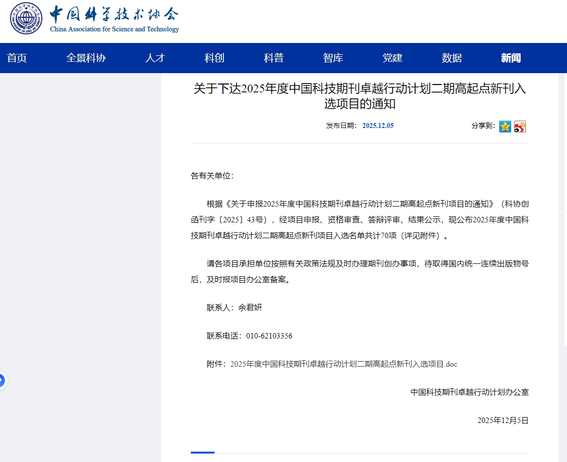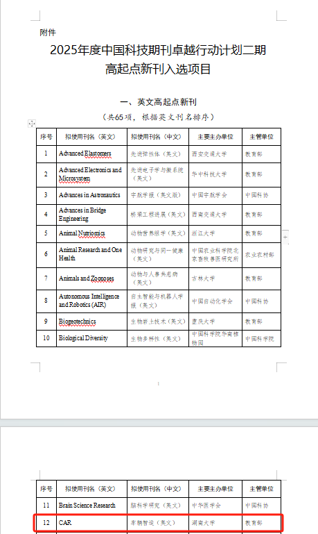 近日,中国科协正式公布2025年度“中国科技期刊卓越行动计划二期高起点新刊”入选项目名单,由湖南大学主办的英文科技期刊《车辆智造(英文)》(CAR)入选。